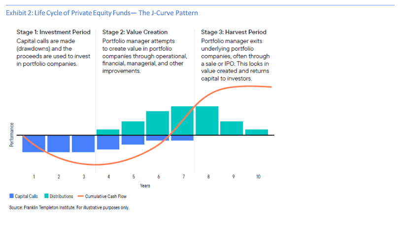 The “J-curve” is the term commonly used to describe the trajectory of a private equity fund’s cashflows and returns. An important liquidity implication of the J-curve is the need for investors to manage their own liquidity, to ensure they can meet capital calls on the front-end of the curve. During the initial investment period, capital is drawn down from investors by the fund manager to invest in portfolio companies. At this stage, investors are paying fees to the manager but will likely not see a markup in the underlying investments for some time.