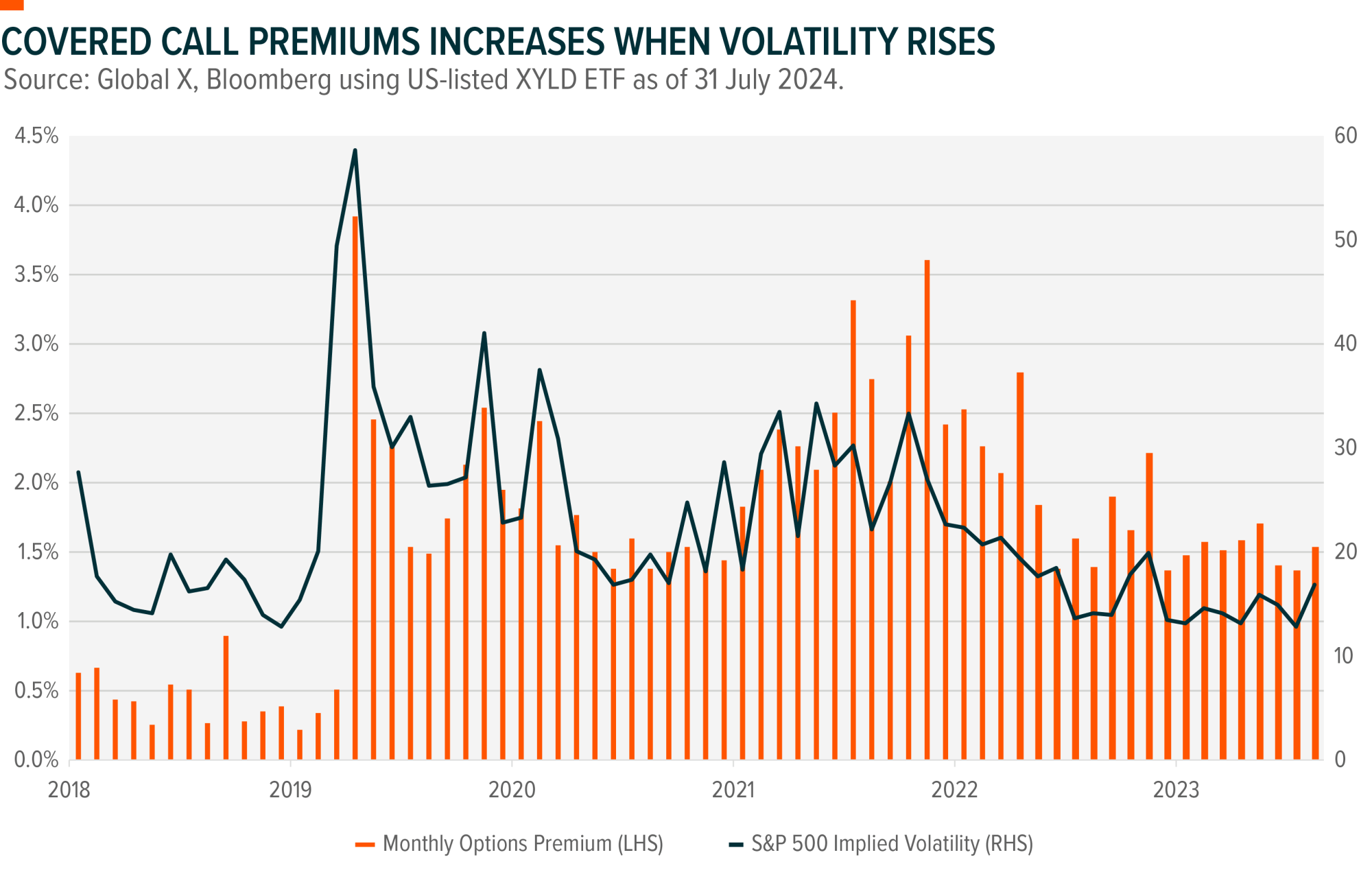 Covered calls provide an opportunity for investors to potentially monetise market volatility. Generally, when volatility rises, the premiums on offer for writing call options increase, which can provide an income avenue for investors. During recent periods of market volatility such as COVID-19 and the inflation shock in 2022, higher implied volatility translated into a pick-up in options premium income for investors.