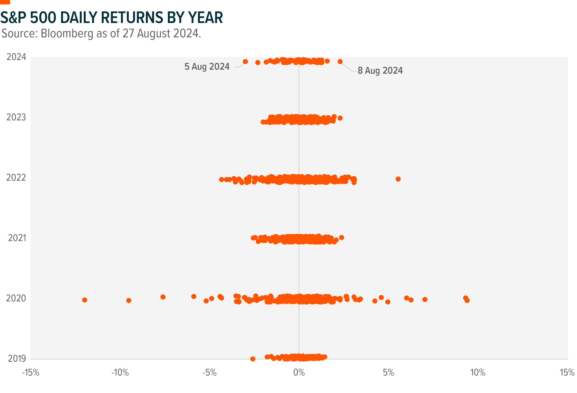 Over the last couple of years, share markets have seen relatively muted volatility. The chart below illustrates the daily movements in the US share market across the last five years, showing that both 2023 and 2024 have been relatively calm compared to the turbulence of 2020 during the COVID-19 pandemic. The early August 2024 points stand out as the most significant outliers so far this year.