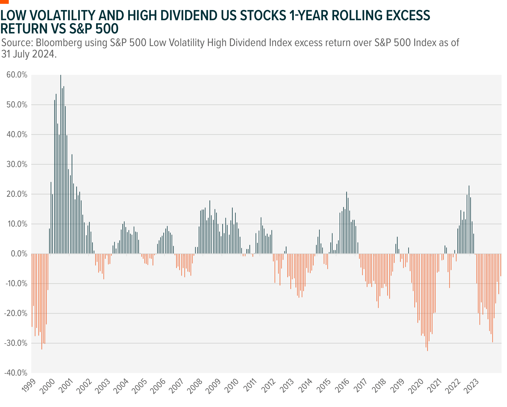 Investors might also consider focusing on income-oriented companies with low volatility characteristics. A multi-factor approach to equities that focuses on both yield and volatility factors can provide exposure to more defensive sectors like utilities, consumer staples, energy, and healthcare. Historically, this strategy has delivered strong performance during volatile periods, including the 2000/01 Dot Com boom, the 2008/09 Global Financial Crisis, 2016 Brexit and US elections, and the 2022 pandemic-induced inflation shock.