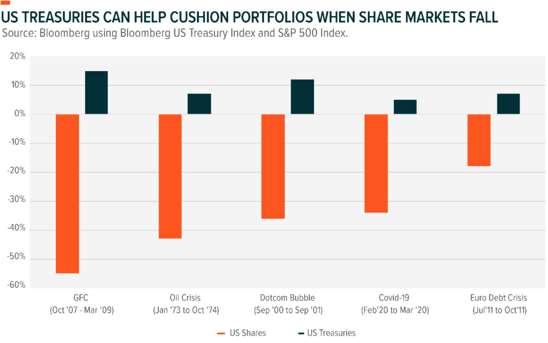 US Treasuries are another example of a safe-haven asset that is highly sought during market volatility due to their status as one of the most reliable assets, backed by the full faith and credit of the US government. In times of uncertainty, investors tend to flock to Treasuries for capital preservation and stability, which helps to offset losses in riskier assets like equities. Adding US Treasuries to a portfolio can provide a valuable hedge against market downturns, reduce overall portfolio risk, and enhance diversification, especially when market conditions are turbulent. US Treasury bonds have a quarter of the risk as US shares3 and can act as a defensive ballast during share market drawdowns.