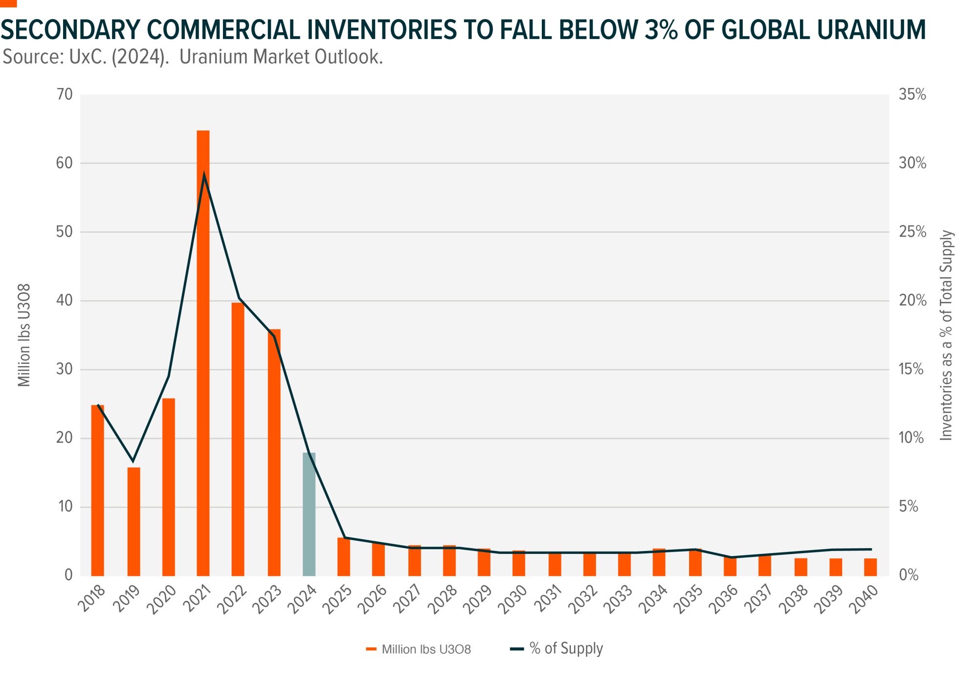 According to analysis by UxC, a leading uranium research firm, commercial supplies of uranium fuel peaked in 2021 (on underutilisation during global lockdowns) at 65 million pounds (~30% of global supply) and has since declined to just 17.5 million pounds in 2024 (~9% of global supply). Forecasts also suggests 2024 will be the last year in which nuclear operators will have access to meaningful reserves. Commercial inventories are set to fall below 7 million pounds or 3% of global supply and stay that low for the foreseeable future. With production slated to stay below global reactor requirements from now to 2030 and beyond, uranium markets may soon be entering a new era of scarcity.